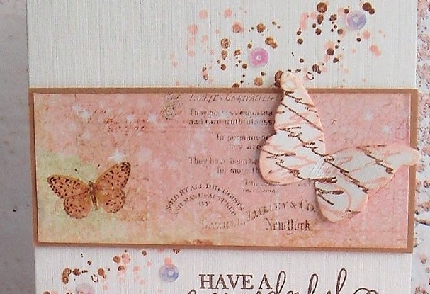 A smaller 12cm square of white linen was stencilled with a honeycomb stencil and distress oxide inks in spun sugar and scattered straw. I used Sizzix dies Aviary and songbird and a wood grain embossing folder to make up the bird house on the stencilled background, the sentiment was stamped with a free stamp from a craft magazine. The finished panel was layered onto the card and the butterfly and a few few sequins added to finish.